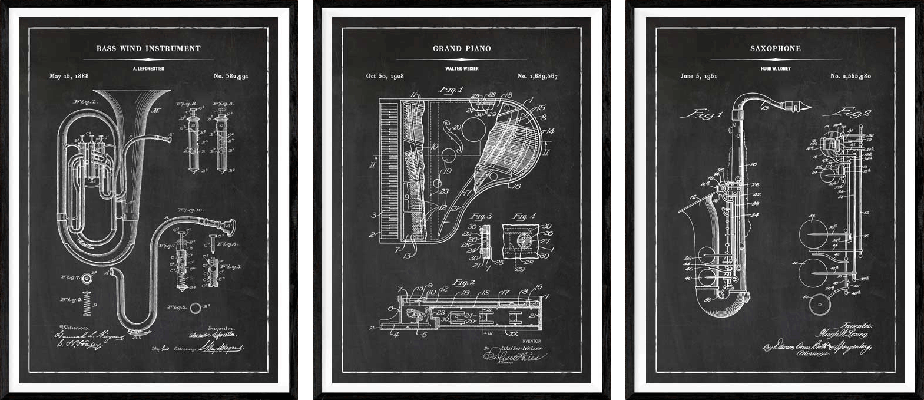 The beautiful details and artistry of their patent drawings, especially from the 19th and early 20th century, has been digitally restored and made available as wall art.